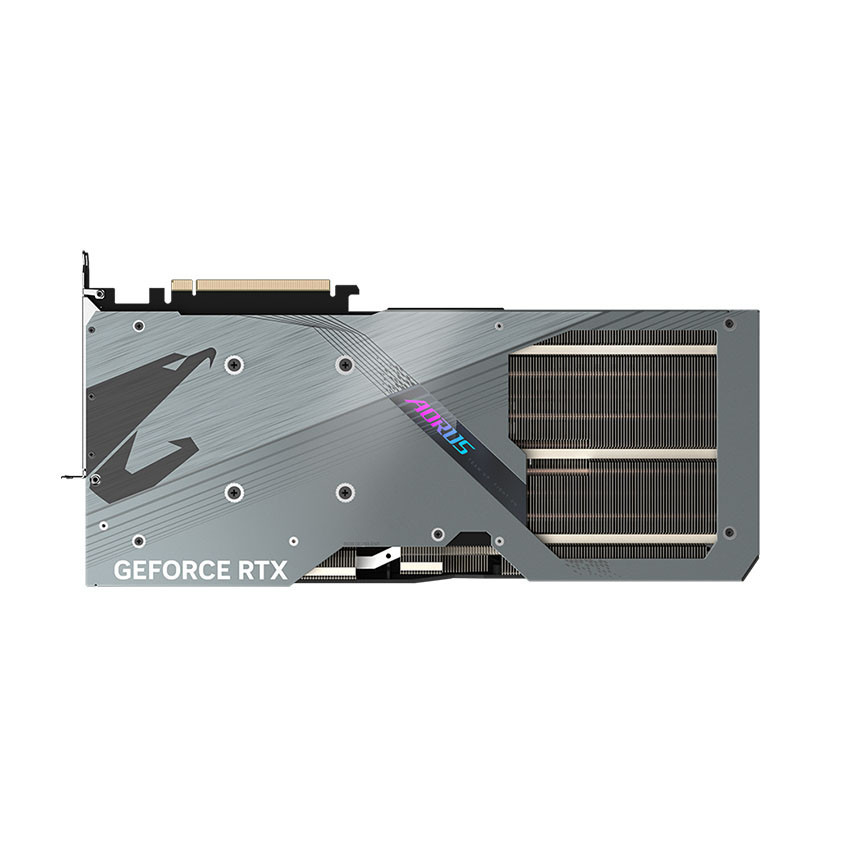 Mặt sau của GIGABYTE AORUS GeForce RTX 4080 MASTER được bảo vệ bởi tấm backplate từ kim loại cứng cáp và bền bỉ, mang đến sự an tâm về cấu trúc và vi mạch bên trong. Ngoài ra, tấm backplate còn là “lớp áo” đẹp mắt với các chi tiết và họa tiết được hoàn thiện tỉ mỉ.
