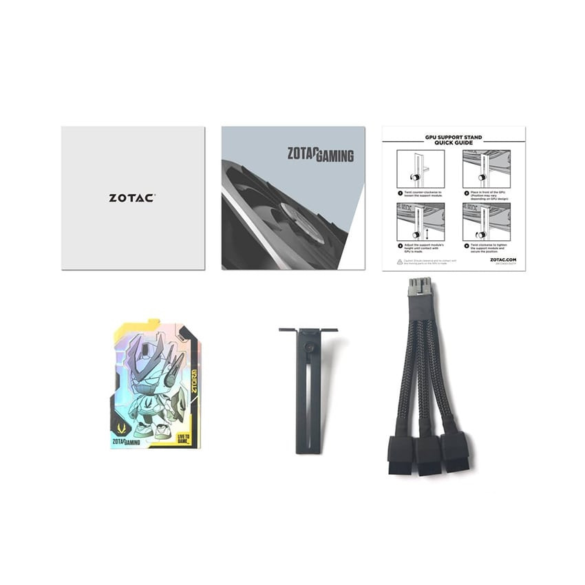 Card màn hình được trang bị thêm giá đỡ GPU (GPU Support Stand) cùng 3 cáp chuyển đổi 8-pin sang 12VHPWR và sách hướng dẫn sử dụng, giúp người dùng dễ dàng lắp đặt và sử dụng.