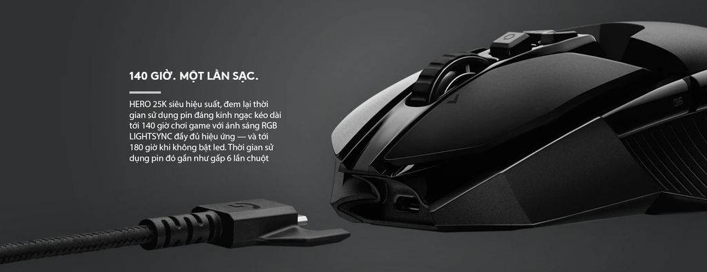 | Tính năng khác | Cảm biến: HERO 16K. Độ phân giải: 100 - 16.000 dpi. Tăng tốc tối đa: >40G. Tốc độ tối đa: > 400 IPS. Tần suất gửi tín hiệu USB/ Không dây: 1000 Hz (1ms). Bộ vi xử lý: 32-bit ARM. Thời gian sử dụng pin: Chiếu sáng mặc định: lên tới 140 giờ, Không chiếu sáng: lên tới 180 giờ. |