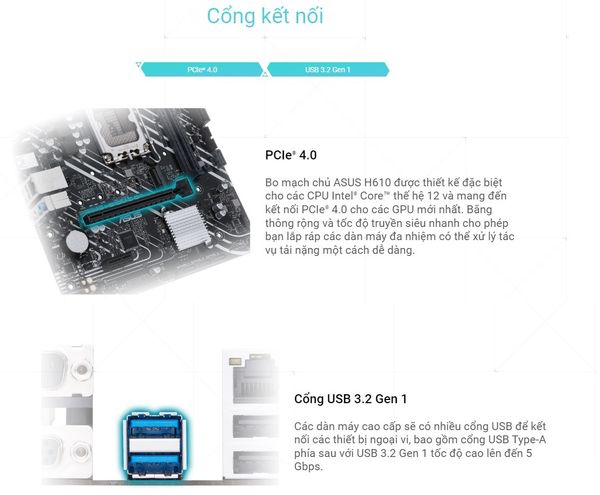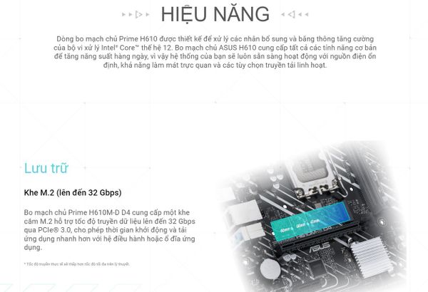 Asus PRIME H610M-K là dòng bo mạch chủ chipset H610 phổ thông, phù hợp với các vi xử lý Pentium, Celeron,i3 & i5 non K thế hệ Alder Lake.