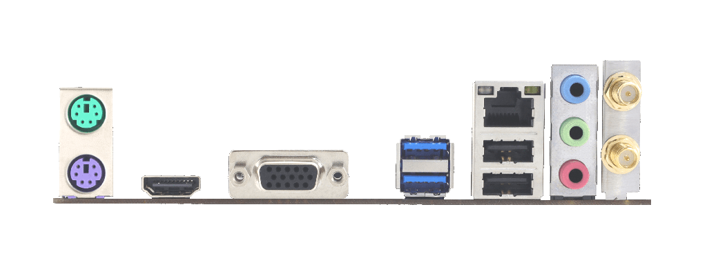 | REAR I/O | 1 x PS/2 Keyboard 1 x PS/2 Mouse 1 x HDMI Port 1 x VGA Port 2 x USB 3.2 (Gen1) Ports 2 x USB 2.0 Ports 1 x LAN port 3 x Audio Jack 1 x WiFi Antenna Port |