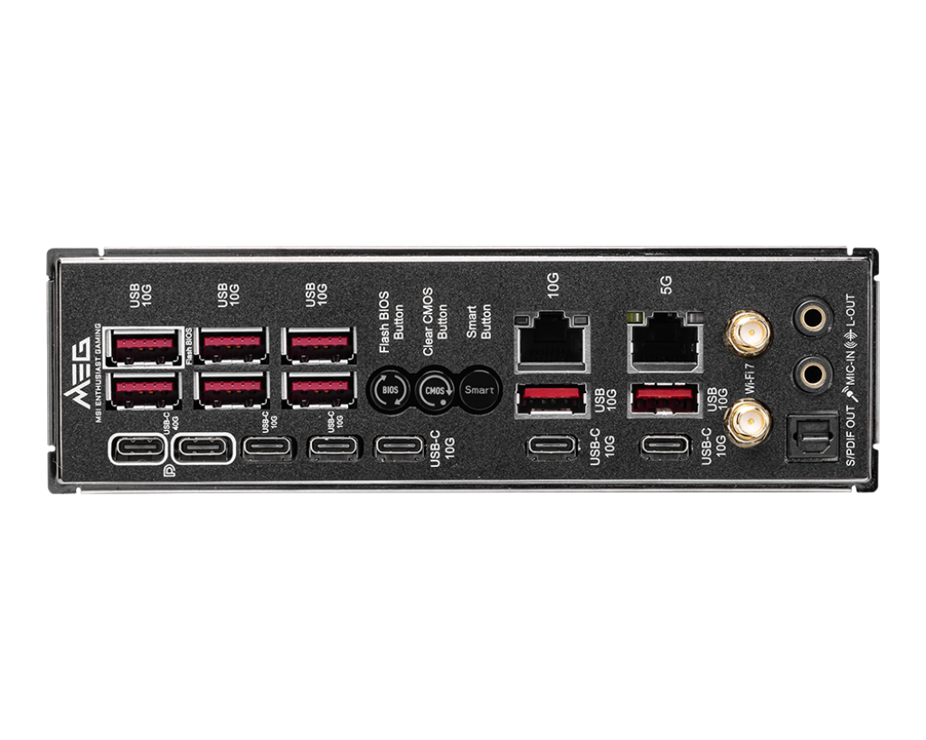 | BACK PANEL PORTS | USB 10Gbps (Type-A) Flash BIOS Button Clear CMOS Button Smart Button 10G LAN 5G LAN Wi-Fi / Bluetooth HD Audio Connectors USB 40Gbps (Type-C) USB 10Gbps (Type-C) USB 10Gbps (Type-A) Optical S/PDIF-Out |