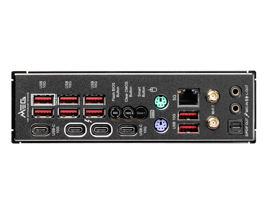 | BACK PANEL PORTS | USB 10Gbps (Type-A) Flash BIOS Button Clear CMOS Button Smart Button 5G LAN Wi-Fi / Bluetooth HD Audio Connectors USB 10Gbps (Type-C) Thunderbolt™ 4 40Gbps (Type-C) USB 10Gbps (Type-C) Keyboard / Mouse USB 10Gbps (Type-A) Optical S/PDIF-Out |