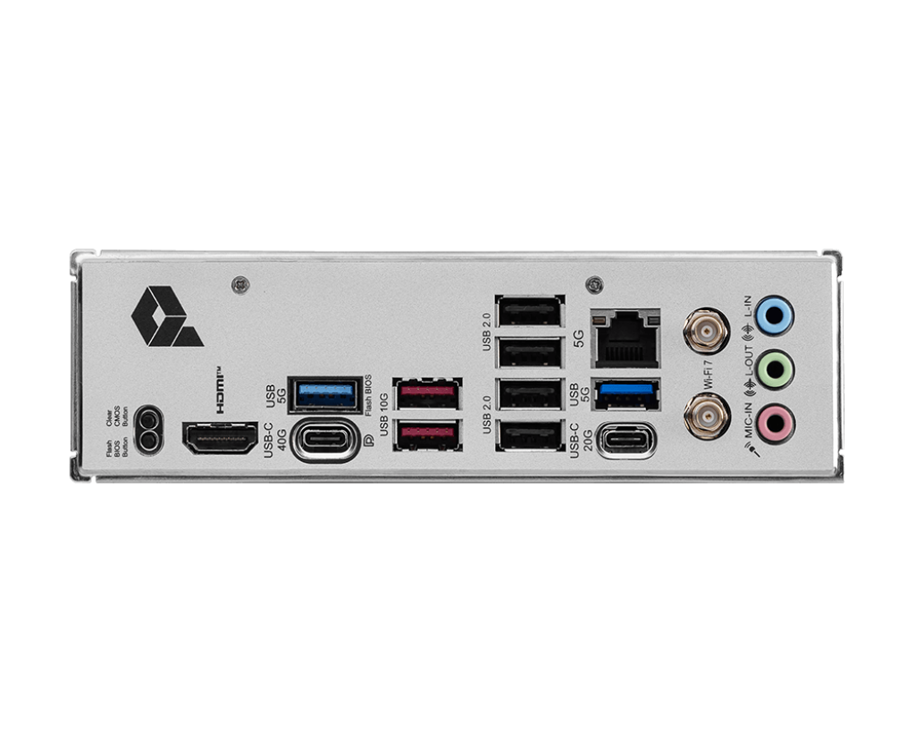 | BACK PANEL PORTS | Clear CMOS Button USB 5Gbps Type-A USB 2.0 5G LAN Wi-Fi / Bluetooth Audio connectors Flash BIOS Button HDMI™ USB 40Gbps Type-C USB 10Gbps Type-A USB 20Gbps Type-C |
