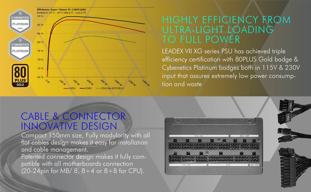 SuperFlower Leadex VII XG 1300W ATX3.1 80 Plus Gold SF-1300F14XG đạt chứng nhận 80 Plus Gold, đảm bảo hiệu suất chuyển đổi điện năng lên đến 90%, giảm thiểu lãng phí năng lượng và tiết kiệm chi phí điện năng cho bạn.