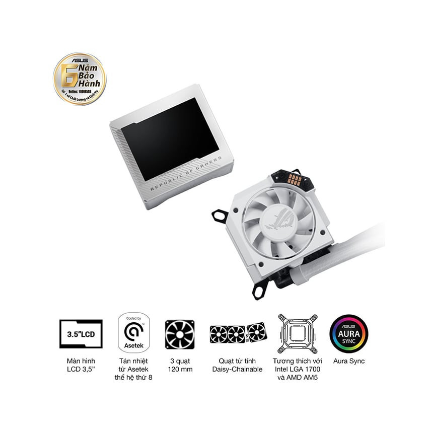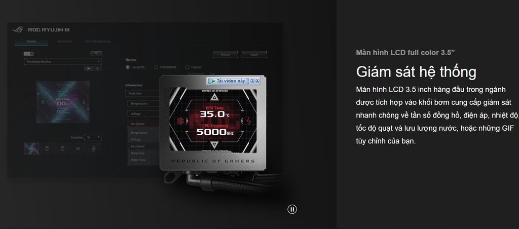 | Phần mềm Armoury Crate cung cấp khả năng kiểm soát hoàn toàn về tốc độ của quạt bơm tích hợp và quạt tản nhiệt, cũng như cho phép hiển thị các thông số hệ thống và tùy chỉnh các hoạt ảnh trên màn hình LCD. |