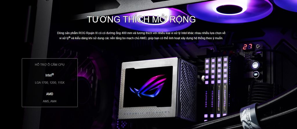 Dòng sản phẩm ROG Ryujin III có có đường ống 400 mm và tương thích với nhiều loại vi xử lý Intel khác nhau nhiều lựa chọn về vi xử lý® và kiểu dáng khi sử dụng các nền tảng bo mạch chủ AMD, giúp bạn có thể linh hoạt xây dựng hệ thống theo ý muốn.