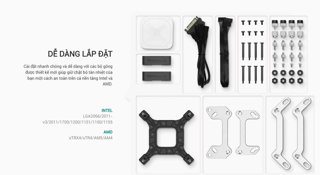 Cài đặt nhanh chóng và dễ dàng với các bộ gông được thiết kế mới giúp giữ chặt bộ tản nhiệt của bạn một cách an toàn trên cả nền tảng Intel và AMD.