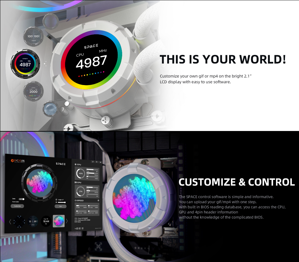 Phiên bản ID-COOLING SPACE SL240 WHITE được nâng cấp với phần màn hình màu hiển thị có kích thước 2.1", độ phân giải 480x480 với 24 bits, 16,7 triệu màu mang lại hình ảnh sắc nét. Người dùng có thể tùy chỉnh phần hiển thị thông số, hoặc cập nhật ảnh cá nhân lên phần hiển thị qua phần mềm đi kèm ID-COOLING SPACE CONTROL 1 cách dễ dàng