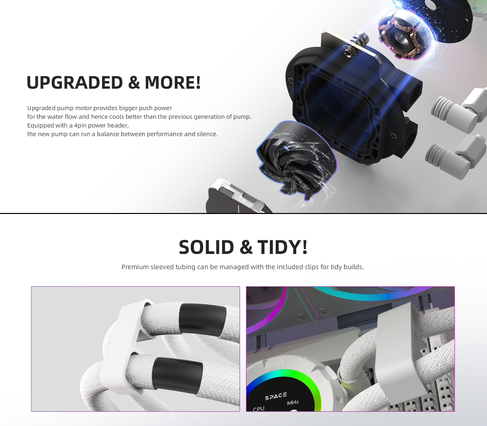 Pump được nâng cấp đáng kể với việc sử dụng vòng bi bằng gốm, giúp tăng cường chịu nhiệt, tăng độ bền và giảm độ hao mòn, giúp cho việc lưu thông chất lỏng hiệu quả hơn. Theo thông số từ NSX, thì pump thế hệ mới trên ID-COOLING SPACE SL360 ARGB có tốc độ bơm lên đến 2500RPM, độ ồn 25dB và độ bền sử dụng lên đến 50.000 giờ