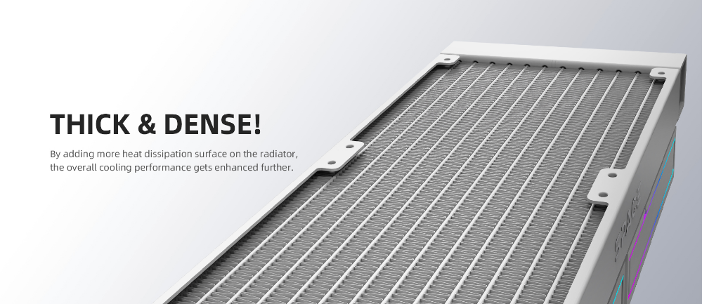 Phần radiator được làm bằng chất liệu nhôm, với việc tăng cường thêm các rãnh thoát nhiệt giúp cho việc giải nhiệt hiệu quả hơn. Radiator của ID-COOLING SPACE SL360 ARGB có chiều dài 27.2cm và độ dày 2.7cm, thích hợp lắp trong hầu hết các bộ case hiện tại