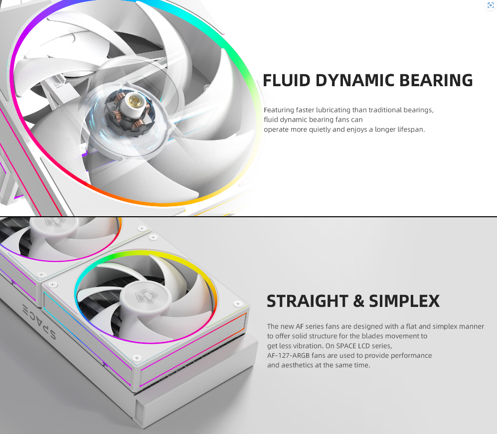 ID-COOLING SPACE SL240 WHITE sử dụng 2 quạt ARGB AF-127-ARGB có tốc độ cao nhất đạt 2000 RPM ±10%, lưu lượng gió 78CFM, áp suất gió 2.68mmH2O và độ ồn tối đa là 29.8dB. Hệ thống quạt AF-127 của ID-COOLING sử dụng vòng bi bạc lót chất lỏng, vì vậy độ bền được tăng cường đáng kể, cũng như khả năng hoạt động êm ái hơn. Bên cạnh đó, hệ thống quạt AF-127 cũng tương thích với các hệ thống đồng bộ RGB trên bo mạch chủ, giúp cho việc điều chỉnh và đồng bộ led dễ dàng hơn
